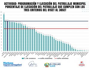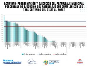 El gráfico adjunto refleja el porcentaje de patrullajes ejecutados durante dicho período, cumpliendo con los tres criterios evaluados: 85 km recorridos, 210 minutos en Área Patrullada (AP) y registro de 03 ocurrencias diarias. Para ser considerados «válidos» en la evaluación del patrullaje, es imperativo que cumplan con el porcentaje requerido según la guía, que establece un mínimo del 75% del patrullaje programado.