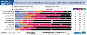 Alfonso López-Chau aparece en segundo lugar en potencial (35% de RPE), aunque más de la mitad de los encuestados (54%) afirma no conocerlo, lo que sugiere que su posicionamiento aún está en construcción.